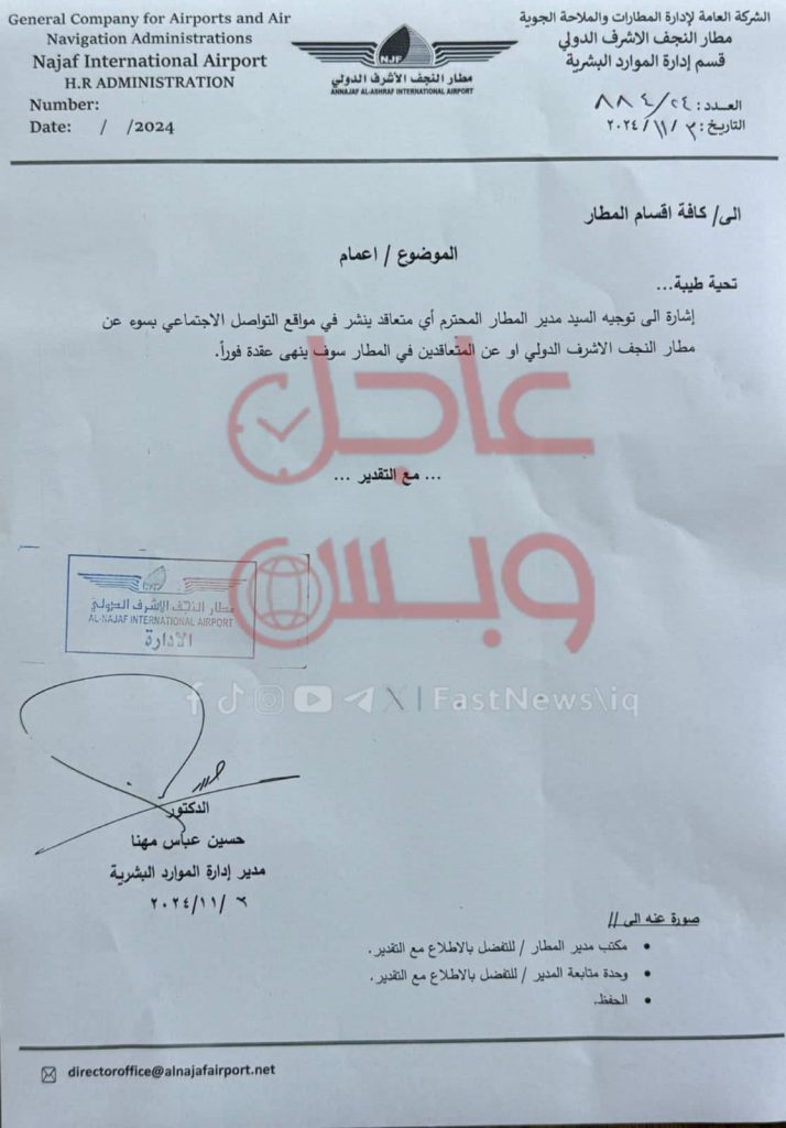 وبحسب وثيقة حصلت عليها (عاجل وبس) فإن إدارة مطار النجف الدولي، أصدرت إجراءات بمنع أي متعاقد من النشر عبر مواقع التواصل الاجتماعي بسوء عن المطار، أو عن المتعاقدين فيه، تصل إلى إنهاء العقود فوراً