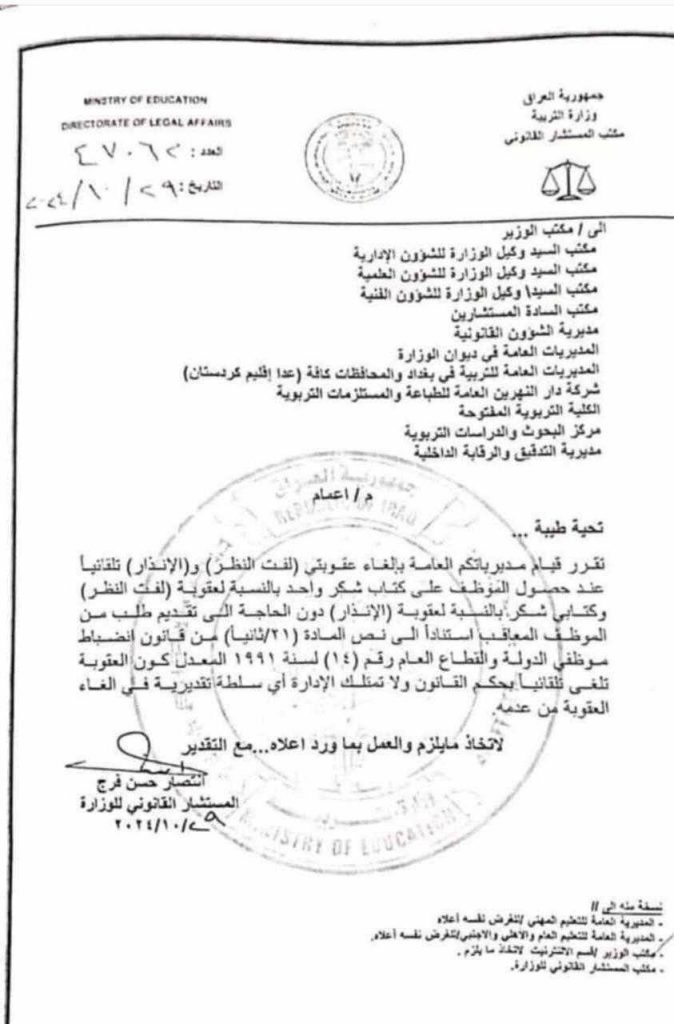 أصدرت وزارة التربية، توجيها مهما يخص إلغاء عقوبتي (لفت النظر والانذار) للموظفين.