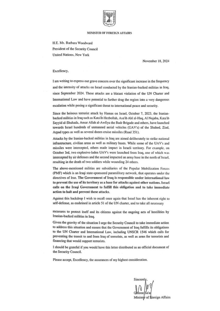 وبعث وزير الخارجية الإسرائيلي جدعون ساعر رسالة إلى مجلس الأمن تحدث فيها عما أسماه بـ “حق إسرائيل في الدفاع عن نفسها”، محملاً الحكومة العراقية مسؤولية الهجمات، فيما طالبها عبر مجلس الأمن للتحرك بالوفاء بالتزاماتها في منع تلك الهجمات”، لاتفاً إلى أن “إسرائيل تحتفظ بحقها في الرد، واتخاذ كل الإجراءات اللازمة لحماية مواطنيها”.