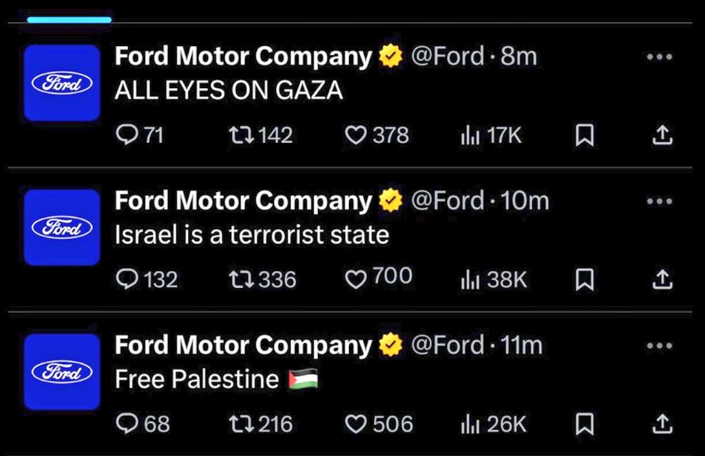 وأضافت: “هذه المنشورات لا تمثل آراء شركة فورد موتور. فورد ومنصة إكس تحققان في هذا الاختراق”.